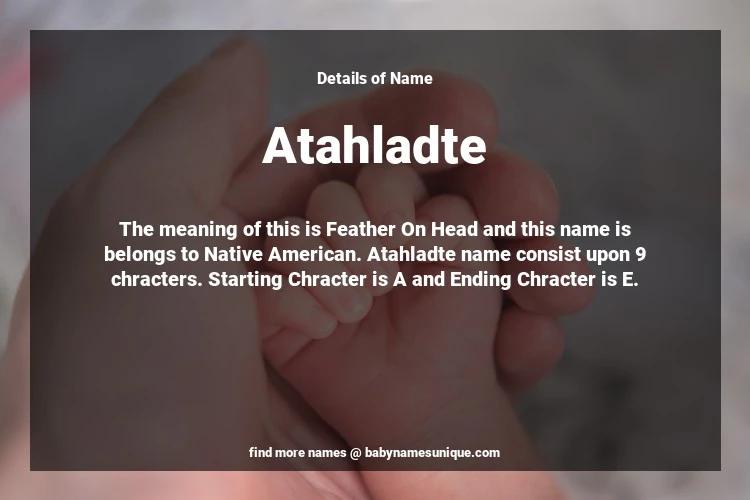 The name Atahladte is chosen by those who are willing to find Unique Transgenders Baby Names. The meaning of this is Feather On Head and this name is belongs to Native American Origin. Baby Name Atahladte consist upon 9 chracters. Starting alphabet is A and ending alphabet is E. This name is used primarily by parents who are considering unique baby names for Transgenders. The Zodiac Sign suitbale for this name are;