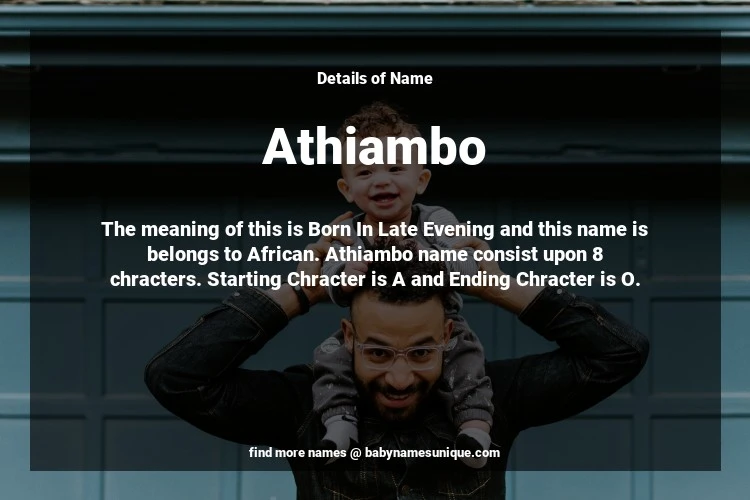 The name Athiambo is chosen by those who are willing to find Unique Transgenders Baby Names. The meaning of this is Born In Late Evening and this name is belongs to African Origin. Baby Name Athiambo consist upon 8 chracters. Starting alphabet is A and ending alphabet is O. This name is used primarily by parents who are considering unique baby names for Transgenders. The Zodiac Sign suitbale for this name are;