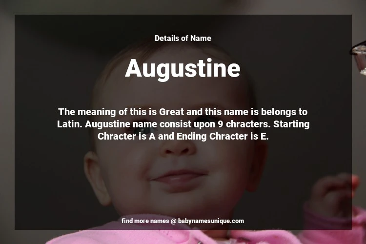 The name Augustine is chosen by those who are willing to find Unique Transgenders Baby Names. The meaning of this is Great and this name is belongs to Latin Origin. Baby Name Augustine consist upon 9 chracters. Starting alphabet is A and ending alphabet is E. This name is used primarily by parents who are considering unique baby names for Transgenders. The Zodiac Sign suitbale for this name are;