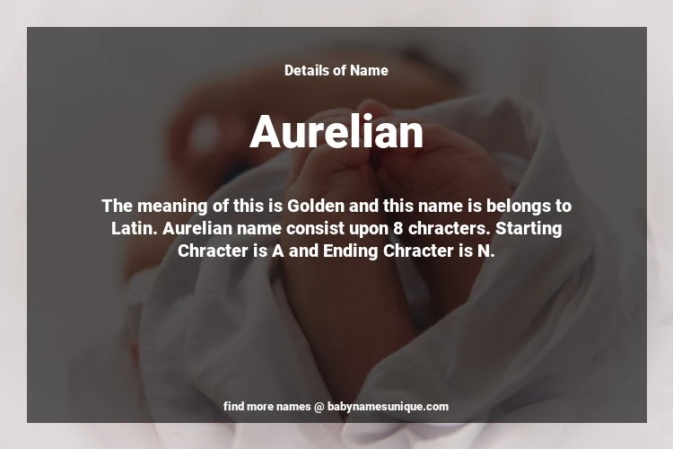 The name Aurelian is chosen by those who are willing to find Unique Boy Baby Names. The meaning of this is Golden and this name is belongs to Latin Origin. Baby Name Aurelian consist upon 8 chracters. Starting alphabet is A and ending alphabet is N. This name is used primarily by parents who are considering unique baby names for Boy. The Zodiac Sign suitbale for this name are;