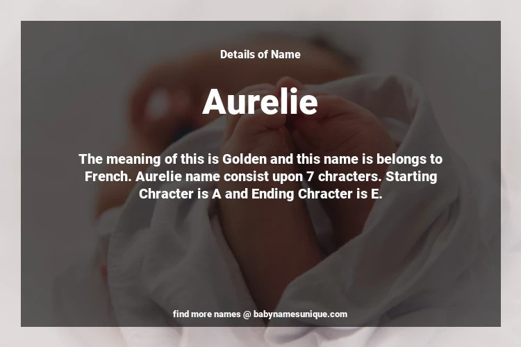The name Aurelie is chosen by those who are willing to find Unique Transgenders Baby Names. The meaning of this is Golden and this name is belongs to French Origin. Baby Name Aurelie consist upon 7 chracters. Starting alphabet is A and ending alphabet is E. This name is used primarily by parents who are considering unique baby names for Transgenders. The Zodiac Sign suitbale for this name are;