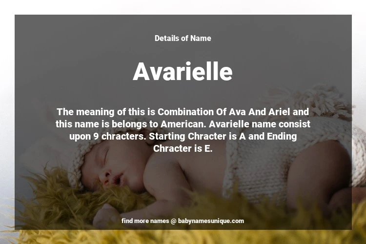 The name Avarielle is chosen by those who are willing to find Unique Transgenders Baby Names. The meaning of this is Combination Of Ava And Ariel and this name is belongs to American Origin. Baby Name Avarielle consist upon 9 chracters. Starting alphabet is A and ending alphabet is E. This name is used primarily by parents who are considering unique baby names for Transgenders. The Zodiac Sign suitbale for this name are;
