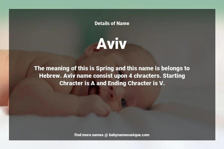 The name Aviv is chosen by those who are willing to find Unique Boy Baby Names. The meaning of this is Spring and this name is belongs to Hebrew Origin. Baby Name Aviv consist upon 4 chracters. Starting alphabet is A and ending alphabet is V. This name is used primarily by parents who are considering unique baby names for Boy. The Zodiac Sign suitbale for this name are;