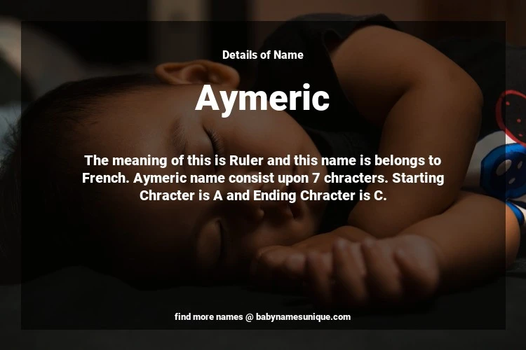 The name Aymeric is chosen by those who are willing to find Unique Boy Baby Names. The meaning of this is Ruler and this name is belongs to French Origin. Baby Name Aymeric consist upon 7 chracters. Starting alphabet is A and ending alphabet is C. This name is used primarily by parents who are considering unique baby names for Boy. The Zodiac Sign suitbale for this name are;