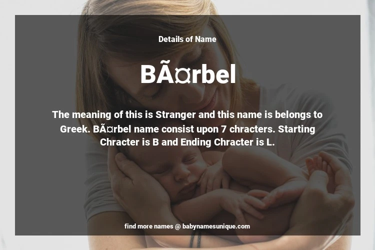 The name Bärbel is chosen by those who are willing to find Unique Transgenders Baby Names. The meaning of this is Stranger and this name is belongs to Greek Origin. Baby Name Bärbel consist upon 7 chracters. Starting alphabet is B and ending alphabet is L. This name is used primarily by parents who are considering unique baby names for Transgenders. The Zodiac Sign suitbale for this name are;