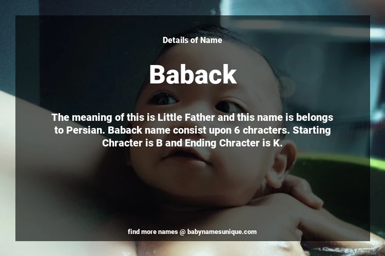 The name Baback is chosen by those who are willing to find Unique Boy Baby Names. The meaning of this is Little Father and this name is belongs to Persian Origin. Baby Name Baback consist upon 6 chracters. Starting alphabet is B and ending alphabet is K. This name is used primarily by parents who are considering unique baby names for Boy. The Zodiac Sign suitbale for this name are;