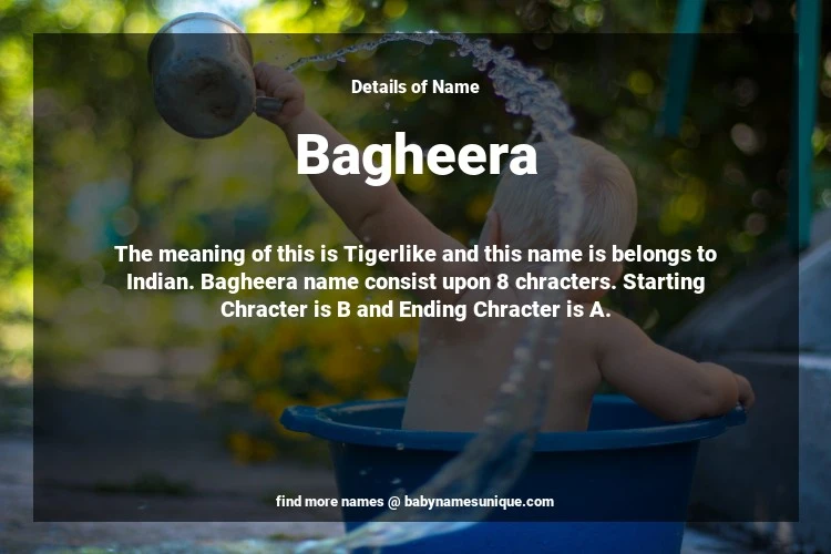 The name Bagheera is chosen by those who are willing to find Unique Transgenders Baby Names. The meaning of this is Tigerlike and this name is belongs to Indian Origin. Baby Name Bagheera consist upon 8 chracters. Starting alphabet is B and ending alphabet is A. This name is used primarily by parents who are considering unique baby names for Transgenders. The Zodiac Sign suitbale for this name are;