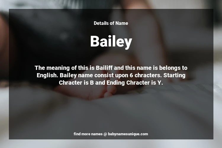The name Bailey is chosen by those who are willing to find Unique Transgenders Baby Names. The meaning of this is Bailiff and this name is belongs to English Origin. Baby Name Bailey consist upon 6 chracters. Starting alphabet is B and ending alphabet is Y. This name is used primarily by parents who are considering unique baby names for Transgenders. The Zodiac Sign suitbale for this name are;