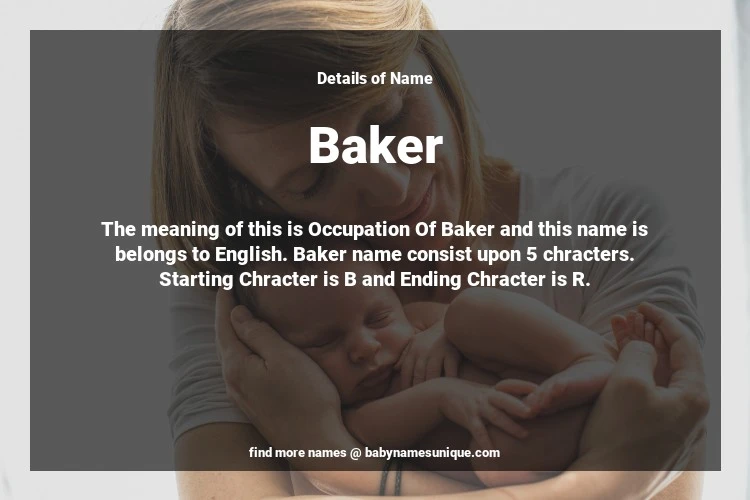 The name Baker is chosen by those who are willing to find Unique Transgenders Baby Names. The meaning of this is Occupation Of Baker and this name is belongs to English Origin. Baby Name Baker consist upon 5 chracters. Starting alphabet is B and ending alphabet is R. This name is used primarily by parents who are considering unique baby names for Transgenders. The Zodiac Sign suitbale for this name are;