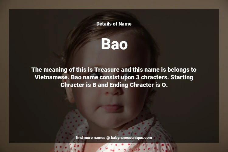 The name Bao is chosen by those who are willing to find Unique Boy Baby Names. The meaning of this is Treasure and this name is belongs to Vietnamese Origin. Baby Name Bao consist upon 3 chracters. Starting alphabet is B and ending alphabet is O. This name is used primarily by parents who are considering unique baby names for Boy. The Zodiac Sign suitbale for this name are;