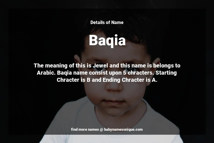 The name Baqia is chosen by those who are willing to find Unique Transgenders Baby Names. The meaning of this is Jewel and this name is belongs to Arabic Origin. Baby Name Baqia consist upon 5 chracters. Starting alphabet is B and ending alphabet is A. This name is used primarily by parents who are considering unique baby names for Transgenders. The Zodiac Sign suitbale for this name are;