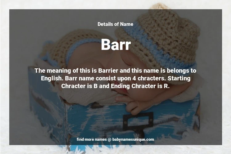 The name Barr is chosen by those who are willing to find Unique Transgenders Baby Names. The meaning of this is Barrier and this name is belongs to English Origin. Baby Name Barr consist upon 4 chracters. Starting alphabet is B and ending alphabet is R. This name is used primarily by parents who are considering unique baby names for Transgenders. The Zodiac Sign suitbale for this name are;