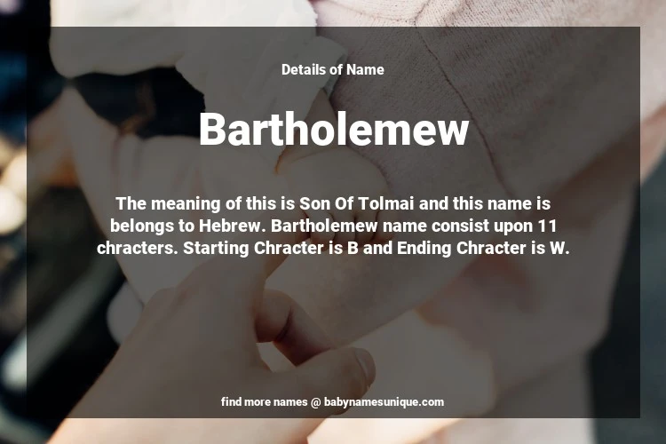 The name Bartholemew is chosen by those who are willing to find Unique Boy Baby Names. The meaning of this is Son Of Tolmai and this name is belongs to Hebrew Origin. Baby Name Bartholemew consist upon 11 chracters. Starting alphabet is B and ending alphabet is W. This name is used primarily by parents who are considering unique baby names for Boy. The Zodiac Sign suitbale for this name are;