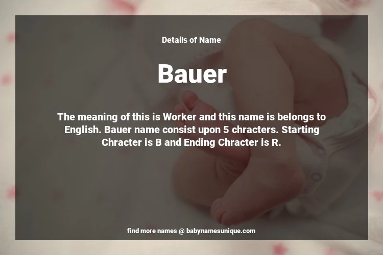 The name Bauer is chosen by those who are willing to find Unique Boy Baby Names. The meaning of this is Worker and this name is belongs to English Origin. Baby Name Bauer consist upon 5 chracters. Starting alphabet is B and ending alphabet is R. This name is used primarily by parents who are considering unique baby names for Boy. The Zodiac Sign suitbale for this name are;