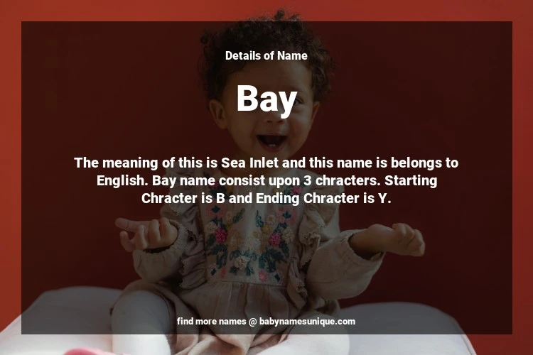 The name Bay is chosen by those who are willing to find Unique Transgenders Baby Names. The meaning of this is Sea Inlet and this name is belongs to English Origin. Baby Name Bay consist upon 3 chracters. Starting alphabet is B and ending alphabet is Y. This name is used primarily by parents who are considering unique baby names for Transgenders. The Zodiac Sign suitbale for this name are;