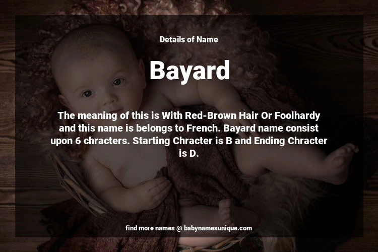 The name Bayard is chosen by those who are willing to find Unique Boy Baby Names. The meaning of this is With Red-Brown Hair Or Foolhardy and this name is belongs to French Origin. Baby Name Bayard consist upon 6 chracters. Starting alphabet is B and ending alphabet is D. This name is used primarily by parents who are considering unique baby names for Boy. The Zodiac Sign suitbale for this name are;