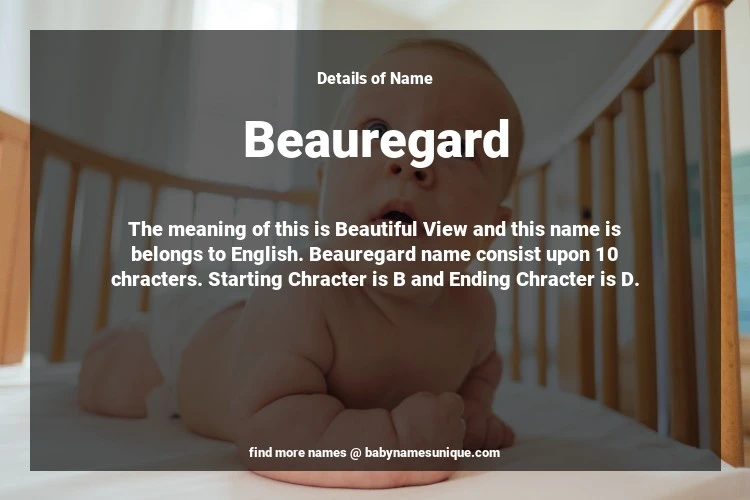 The name Beauregard is chosen by those who are willing to find Unique Boy Baby Names. The meaning of this is Beautiful View and this name is belongs to English Origin. Baby Name Beauregard consist upon 10 chracters. Starting alphabet is B and ending alphabet is D. This name is used primarily by parents who are considering unique baby names for Boy. The Zodiac Sign suitbale for this name are;