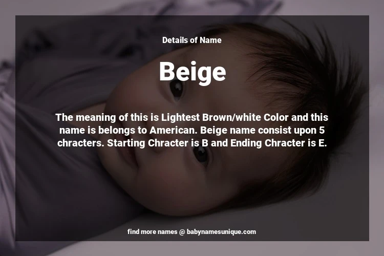 The name Beige is chosen by those who are willing to find Unique Transgenders Baby Names. The meaning of this is Lightest Brown/white Color and this name is belongs to American Origin. Baby Name Beige consist upon 5 chracters. Starting alphabet is B and ending alphabet is E. This name is used primarily by parents who are considering unique baby names for Transgenders. The Zodiac Sign suitbale for this name are;