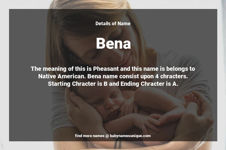 The name Bena is chosen by those who are willing to find Unique Transgenders Baby Names. The meaning of this is Pheasant and this name is belongs to Native American Origin. Baby Name Bena consist upon 4 chracters. Starting alphabet is B and ending alphabet is A. This name is used primarily by parents who are considering unique baby names for Transgenders. The Zodiac Sign suitbale for this name are;