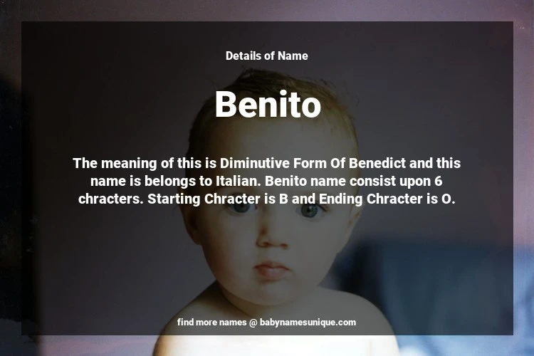 The name Benito is chosen by those who are willing to find Unique Boy Baby Names. The meaning of this is Diminutive Form Of Benedict and this name is belongs to Italian Origin. Baby Name Benito consist upon 6 chracters. Starting alphabet is B and ending alphabet is O. This name is used primarily by parents who are considering unique baby names for Boy. The Zodiac Sign suitbale for this name are;