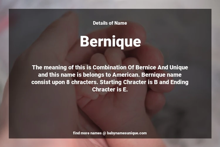 The name Bernique is chosen by those who are willing to find Unique Transgenders Baby Names. The meaning of this is Combination Of Bernice And Unique and this name is belongs to American Origin. Baby Name Bernique consist upon 8 chracters. Starting alphabet is B and ending alphabet is E. This name is used primarily by parents who are considering unique baby names for Transgenders. The Zodiac Sign suitbale for this name are;