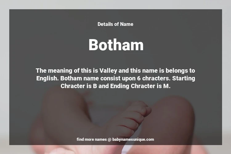 The name Botham is chosen by those who are willing to find Unique Transgenders Baby Names. The meaning of this is Valley and this name is belongs to English Origin. Baby Name Botham consist upon 6 chracters. Starting alphabet is B and ending alphabet is M. This name is used primarily by parents who are considering unique baby names for Transgenders. The Zodiac Sign suitbale for this name are;