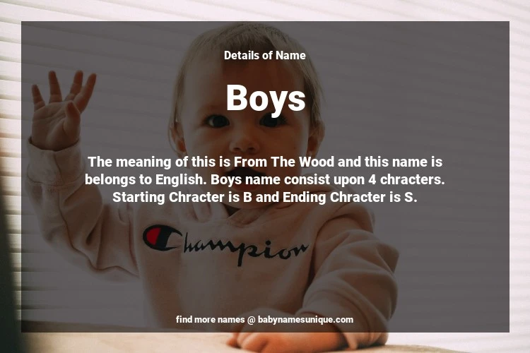 The name Boys is chosen by those who are willing to find Unique Boy Baby Names. The meaning of this is From The Wood and this name is belongs to English Origin. Baby Name Boys consist upon 4 chracters. Starting alphabet is B and ending alphabet is S. This name is used primarily by parents who are considering unique baby names for Boy. The Zodiac Sign suitbale for this name are;