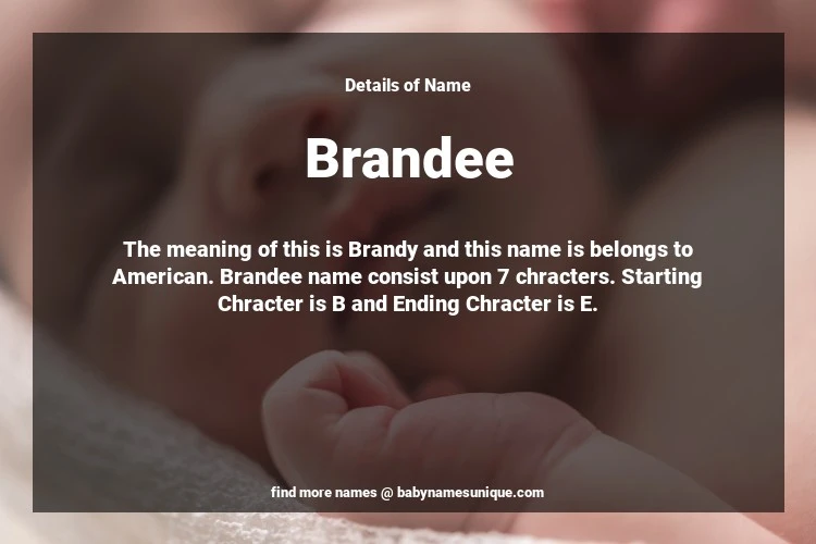 The name Brandee is chosen by those who are willing to find Unique Transgenders Baby Names. The meaning of this is Brandy and this name is belongs to American Origin. Baby Name Brandee consist upon 7 chracters. Starting alphabet is B and ending alphabet is E. This name is used primarily by parents who are considering unique baby names for Transgenders. The Zodiac Sign suitbale for this name are;