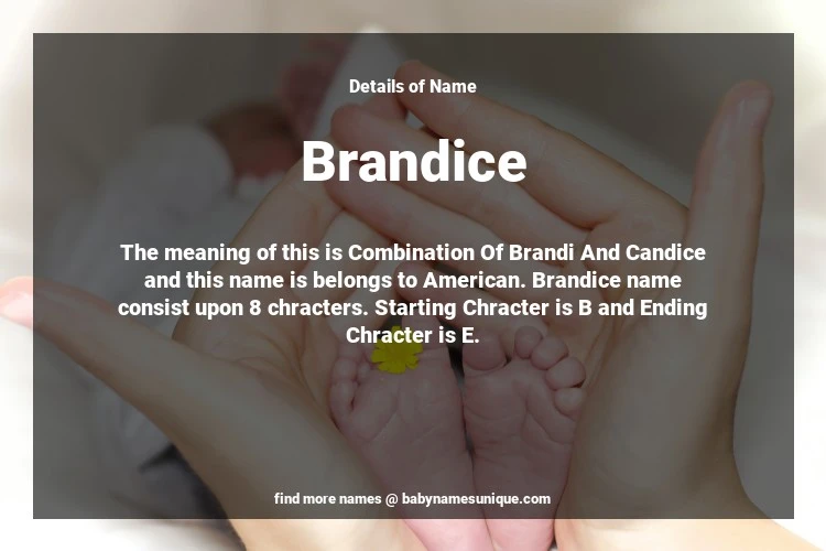 The name Brandice is chosen by those who are willing to find Unique Transgenders Baby Names. The meaning of this is Combination Of Brandi And Candice and this name is belongs to American Origin. Baby Name Brandice consist upon 8 chracters. Starting alphabet is B and ending alphabet is E. This name is used primarily by parents who are considering unique baby names for Transgenders. The Zodiac Sign suitbale for this name are;