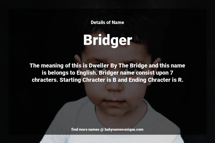 The name Bridger is chosen by those who are willing to find Unique Boy Baby Names. The meaning of this is Dweller By The Bridge and this name is belongs to English Origin. Baby Name Bridger consist upon 7 chracters. Starting alphabet is B and ending alphabet is R. This name is used primarily by parents who are considering unique baby names for Boy. The Zodiac Sign suitbale for this name are;