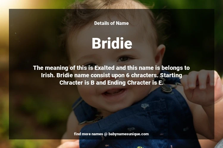 The name Bridie is chosen by those who are willing to find Unique Transgenders Baby Names. The meaning of this is Exalted and this name is belongs to Irish Origin. Baby Name Bridie consist upon 6 chracters. Starting alphabet is B and ending alphabet is E. This name is used primarily by parents who are considering unique baby names for Transgenders. The Zodiac Sign suitbale for this name are;
