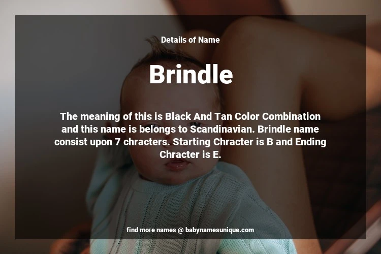 The name Brindle is chosen by those who are willing to find Unique Transgenders Baby Names. The meaning of this is Black And Tan Color Combination and this name is belongs to Scandinavian Origin. Baby Name Brindle consist upon 7 chracters. Starting alphabet is B and ending alphabet is E. This name is used primarily by parents who are considering unique baby names for Transgenders. The Zodiac Sign suitbale for this name are;