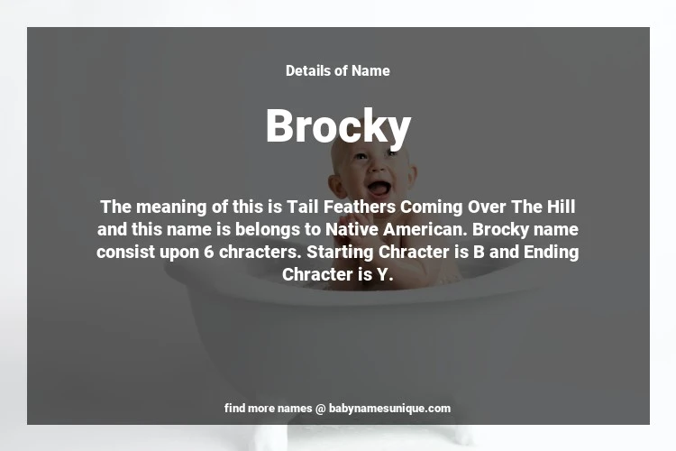 The name Brocky is chosen by those who are willing to find Unique Transgenders Baby Names. The meaning of this is Tail Feathers Coming Over The Hill and this name is belongs to Native American Origin. Baby Name Brocky consist upon 6 chracters. Starting alphabet is B and ending alphabet is Y. This name is used primarily by parents who are considering unique baby names for Transgenders. The Zodiac Sign suitbale for this name are;