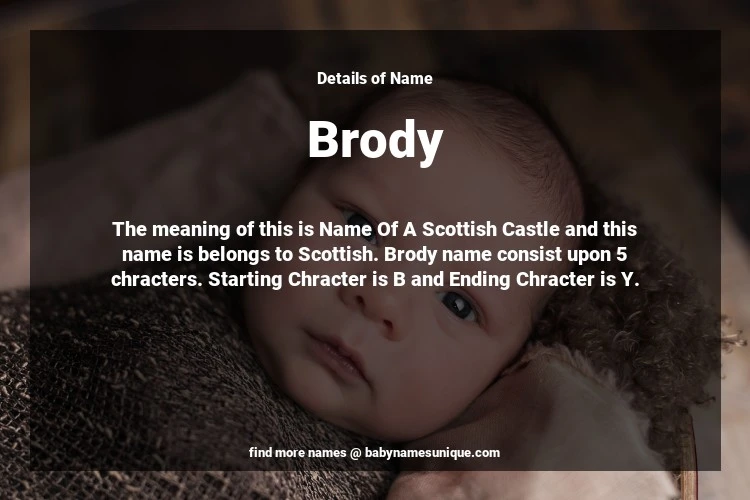 The name Brody is chosen by those who are willing to find Unique Transgenders Baby Names. The meaning of this is Name Of A Scottish Castle and this name is belongs to Scottish Origin. Baby Name Brody consist upon 5 chracters. Starting alphabet is B and ending alphabet is Y. This name is used primarily by parents who are considering unique baby names for Transgenders. The Zodiac Sign suitbale for this name are;