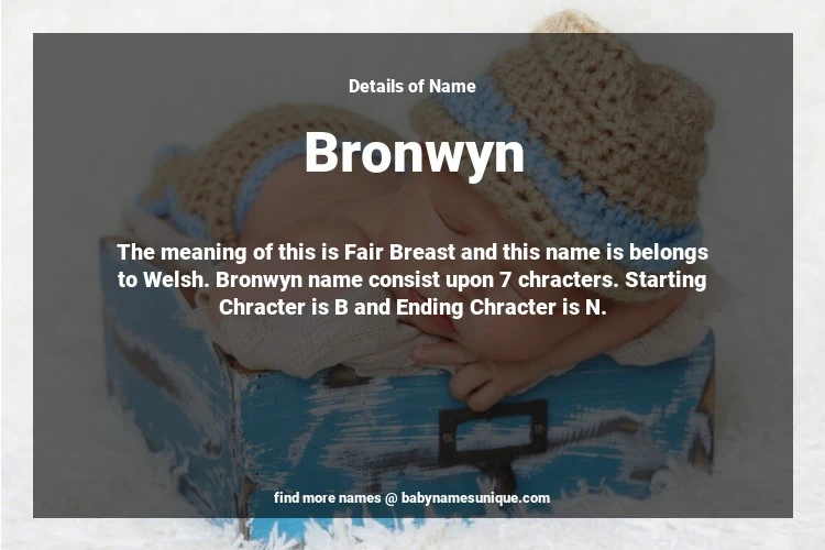 The name Bronwyn is chosen by those who are willing to find Unique Transgenders Baby Names. The meaning of this is Fair Breast and this name is belongs to Welsh Origin. Baby Name Bronwyn consist upon 7 chracters. Starting alphabet is B and ending alphabet is N. This name is used primarily by parents who are considering unique baby names for Transgenders. The Zodiac Sign suitbale for this name are;