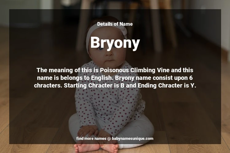 The name Bryony is chosen by those who are willing to find Unique Transgenders Baby Names. The meaning of this is Poisonous Climbing Vine and this name is belongs to English Origin. Baby Name Bryony consist upon 6 chracters. Starting alphabet is B and ending alphabet is Y. This name is used primarily by parents who are considering unique baby names for Transgenders. The Zodiac Sign suitbale for this name are;
