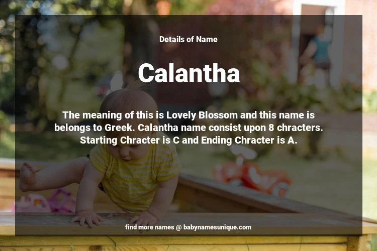 The name Calantha is chosen by those who are willing to find Unique Transgenders Baby Names. The meaning of this is Lovely Blossom and this name is belongs to Greek Origin. Baby Name Calantha consist upon 8 chracters. Starting alphabet is C and ending alphabet is A. This name is used primarily by parents who are considering unique baby names for Transgenders. The Zodiac Sign suitbale for this name are;