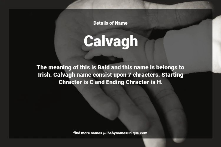 The name Calvagh is chosen by those who are willing to find Unique Boy Baby Names. The meaning of this is Bald and this name is belongs to Irish Origin. Baby Name Calvagh consist upon 7 chracters. Starting alphabet is C and ending alphabet is H. This name is used primarily by parents who are considering unique baby names for Boy. The Zodiac Sign suitbale for this name are;