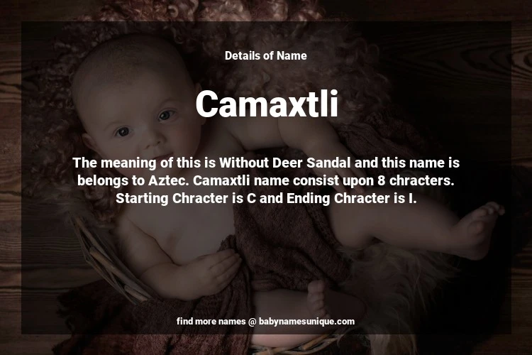The name Camaxtli is chosen by those who are willing to find Unique Boy Baby Names. The meaning of this is Without Deer Sandal and this name is belongs to Aztec Origin. Baby Name Camaxtli consist upon 8 chracters. Starting alphabet is C and ending alphabet is I. This name is used primarily by parents who are considering unique baby names for Boy. The Zodiac Sign suitbale for this name are;
