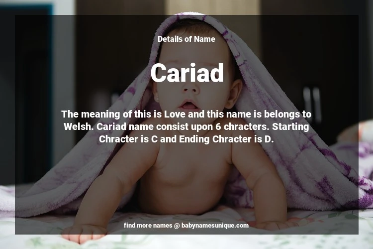 The name Cariad is chosen by those who are willing to find Unique Transgenders Baby Names. The meaning of this is Love and this name is belongs to Welsh Origin. Baby Name Cariad consist upon 6 chracters. Starting alphabet is C and ending alphabet is D. This name is used primarily by parents who are considering unique baby names for Transgenders. The Zodiac Sign suitbale for this name are;