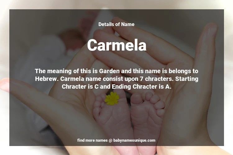 The name Carmela is chosen by those who are willing to find Unique Transgenders Baby Names. The meaning of this is Garden and this name is belongs to Hebrew Origin. Baby Name Carmela consist upon 7 chracters. Starting alphabet is C and ending alphabet is A. This name is used primarily by parents who are considering unique baby names for Transgenders. The Zodiac Sign suitbale for this name are;
