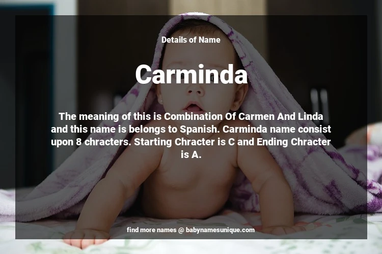 The name Carminda is chosen by those who are willing to find Unique Transgenders Baby Names. The meaning of this is Combination Of Carmen And Linda and this name is belongs to Spanish Origin. Baby Name Carminda consist upon 8 chracters. Starting alphabet is C and ending alphabet is A. This name is used primarily by parents who are considering unique baby names for Transgenders. The Zodiac Sign suitbale for this name are;