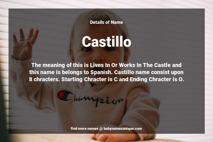 The name Castillo is chosen by those who are willing to find Unique Transgenders Baby Names. The meaning of this is Lives In Or Works In The Castle and this name is belongs to Spanish Origin. Baby Name Castillo consist upon 8 chracters. Starting alphabet is C and ending alphabet is O. This name is used primarily by parents who are considering unique baby names for Transgenders. The Zodiac Sign suitbale for this name are;