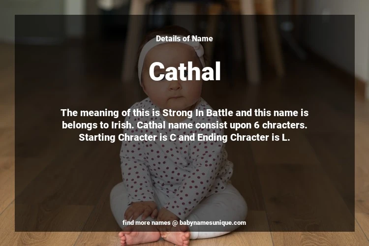 The name Cathal is chosen by those who are willing to find Unique Boy Baby Names. The meaning of this is Strong In Battle and this name is belongs to Irish Origin. Baby Name Cathal consist upon 6 chracters. Starting alphabet is C and ending alphabet is L. This name is used primarily by parents who are considering unique baby names for Boy. The Zodiac Sign suitbale for this name are;