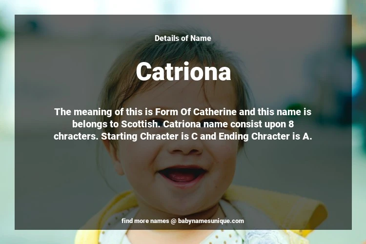 The name Catriona is chosen by those who are willing to find Unique Transgenders Baby Names. The meaning of this is Form Of Catherine and this name is belongs to Scottish Origin. Baby Name Catriona consist upon 8 chracters. Starting alphabet is C and ending alphabet is A. This name is used primarily by parents who are considering unique baby names for Transgenders. The Zodiac Sign suitbale for this name are;