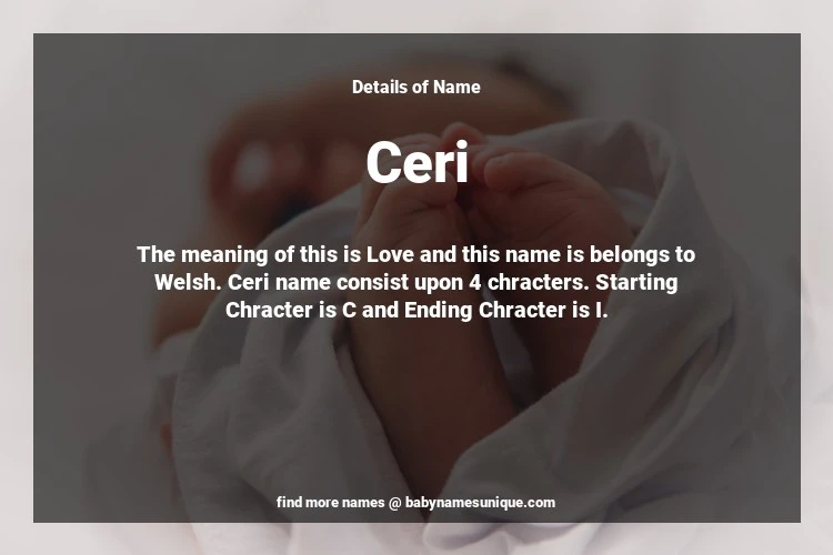 The name Ceri is chosen by those who are willing to find Unique Transgenders Baby Names. The meaning of this is Love and this name is belongs to Welsh Origin. Baby Name Ceri consist upon 4 chracters. Starting alphabet is C and ending alphabet is I. This name is used primarily by parents who are considering unique baby names for Transgenders. The Zodiac Sign suitbale for this name are;