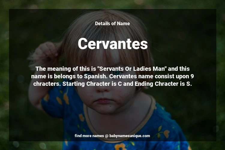 The name Cervantes is chosen by those who are willing to find Unique Transgenders Baby Names. The meaning of this is "Servants Or Ladies Man" and this name is belongs to Spanish Origin. Baby Name Cervantes consist upon 9 chracters. Starting alphabet is C and ending alphabet is S. This name is used primarily by parents who are considering unique baby names for Transgenders. The Zodiac Sign suitbale for this name are;