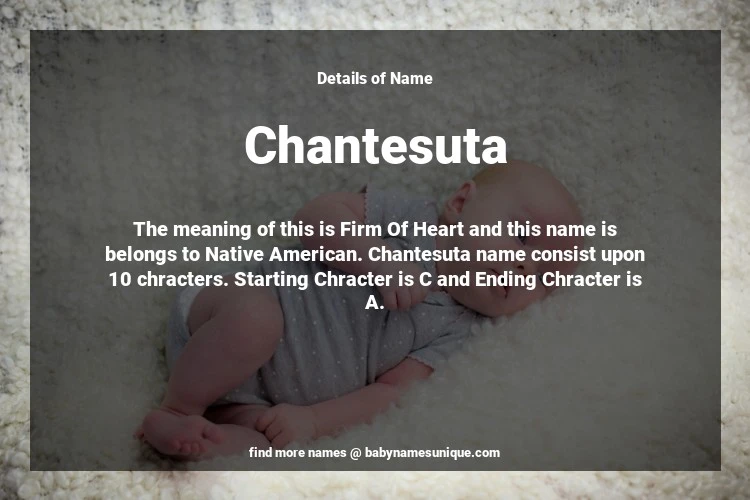 The name Chantesuta is chosen by those who are willing to find Unique Transgenders Baby Names. The meaning of this is Firm Of Heart and this name is belongs to Native American Origin. Baby Name Chantesuta consist upon 10 chracters. Starting alphabet is C and ending alphabet is A. This name is used primarily by parents who are considering unique baby names for Transgenders. The Zodiac Sign suitbale for this name are;