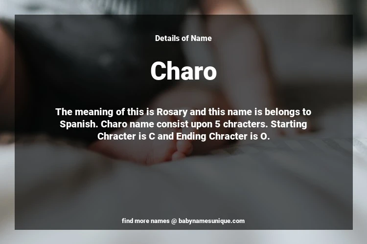 The name Charo is chosen by those who are willing to find Unique Transgenders Baby Names. The meaning of this is Rosary and this name is belongs to Spanish Origin. Baby Name Charo consist upon 5 chracters. Starting alphabet is C and ending alphabet is O. This name is used primarily by parents who are considering unique baby names for Transgenders. The Zodiac Sign suitbale for this name are;