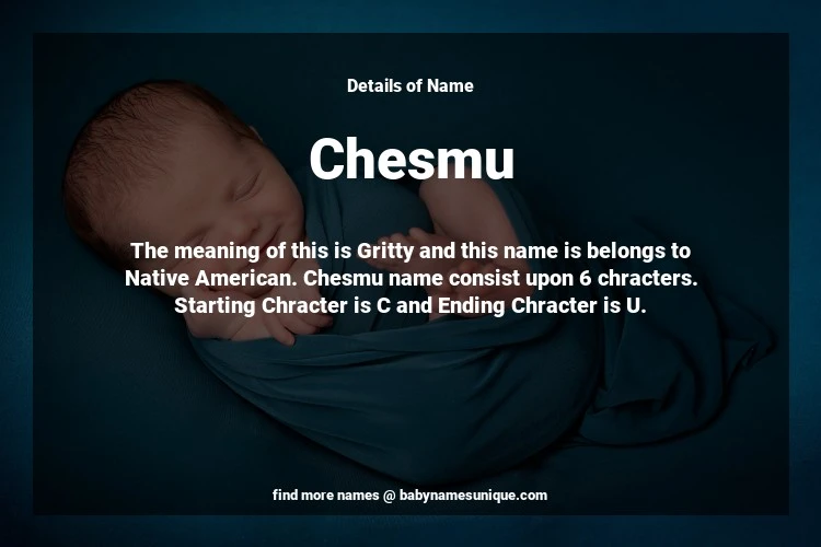 The name Chesmu is chosen by those who are willing to find Unique Boy Baby Names. The meaning of this is Gritty and this name is belongs to Native American Origin. Baby Name Chesmu consist upon 6 chracters. Starting alphabet is C and ending alphabet is U. This name is used primarily by parents who are considering unique baby names for Boy. The Zodiac Sign suitbale for this name are;